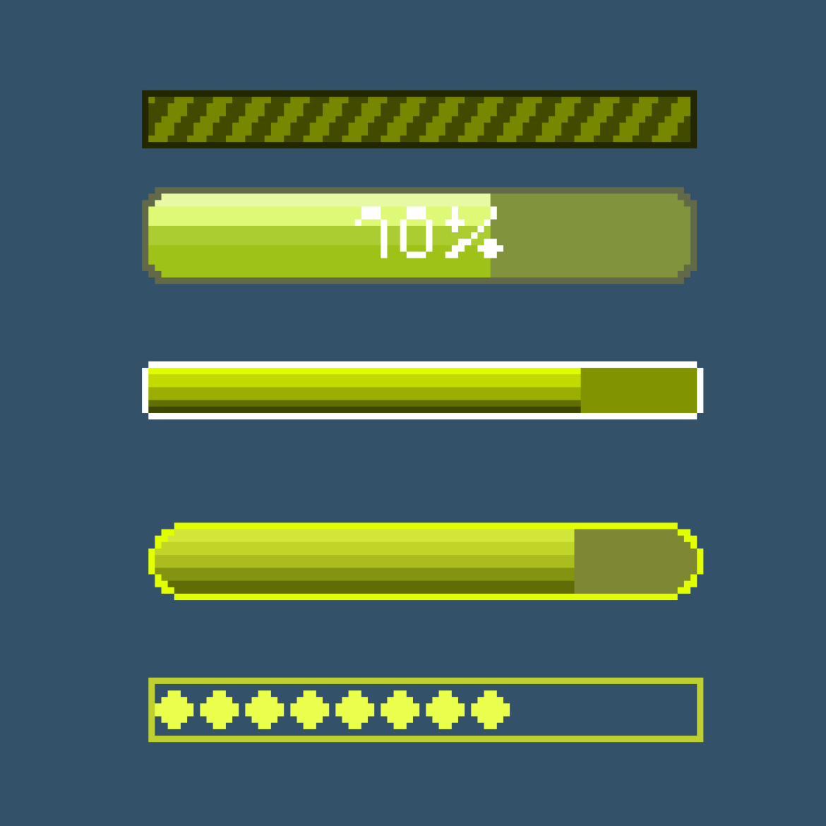 A set of five pixel art green progress bars, perfect for health, stamina, loading screens, or XP meters in retro-style games. Each bar features a clean, minimalistic design with smooth progression stages, making them ideal for platformers, RPGs, and strategy games. The set includes different fill levels, allowing for easy implementation in various game mechanics.